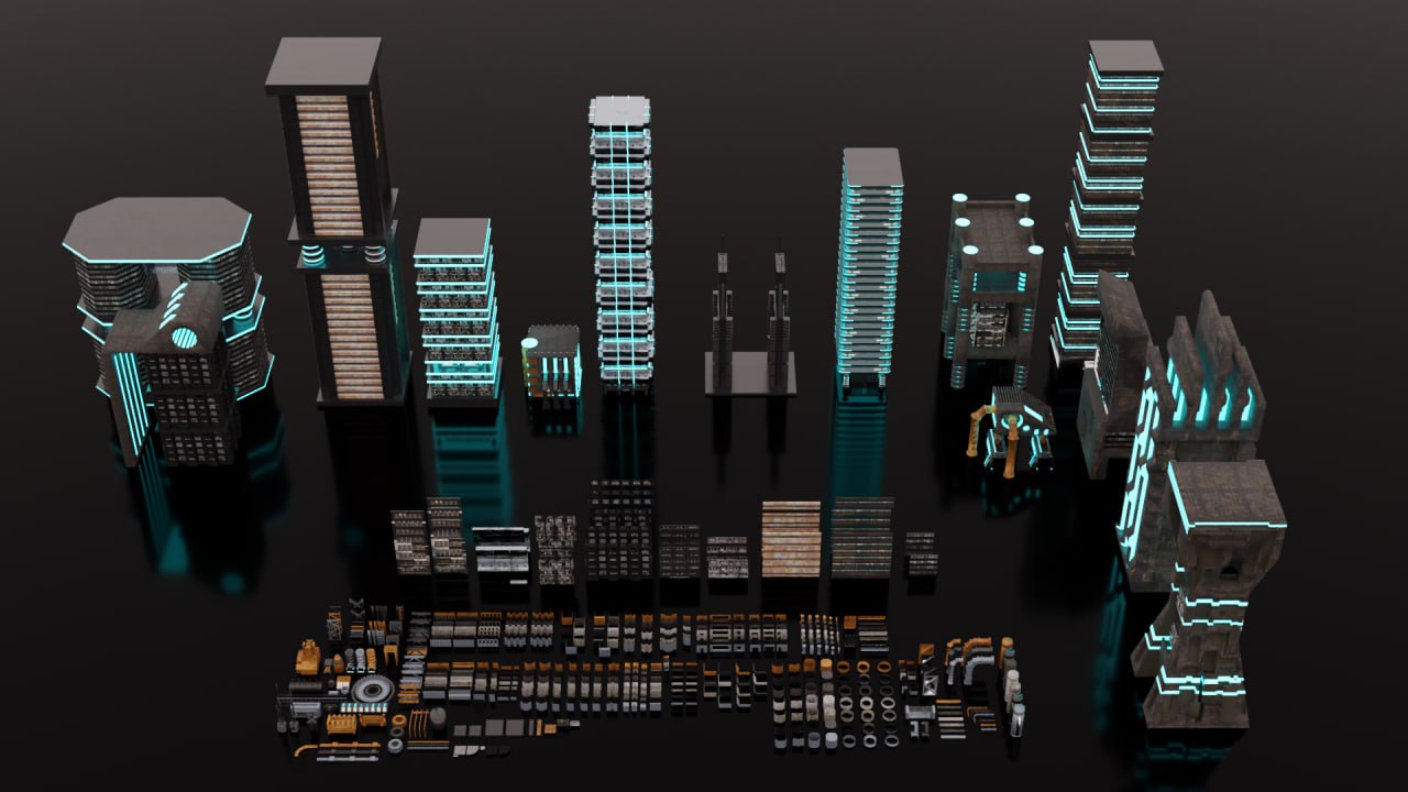 这套3D模型资源包含多种科幻风格的建筑结构和其他未来场景资产,适用于构建未来世界的各种场景。