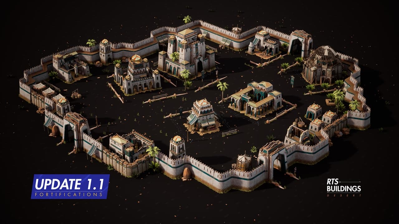 这是一套沙漠主题的即时战略(RTS)建筑资产包。
