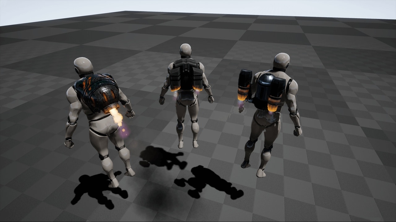包含完整的角色飞行动画(适配Unreal默认骨骼),以及可直接附加到任何角色的喷气背包Actor蓝图。集成时需复制第三人称角色的动画蓝图代码(详见集成视频/文档),设计上确保与现有系统无缝兼容。