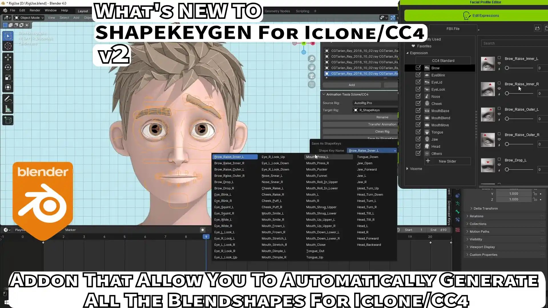 使用 ShapeKeyGen For Iclone/CC4 Blender 插件,简化您的工作流程!只需一键即可生成与 iClone 和 CC4 表情滑块兼容的形状键,节省您宝贵的时间和精力。