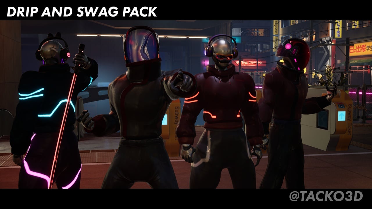 包含赛博朋克主题的道具与配饰。服装与鞋类均绑定至虚幻引擎5骨架。