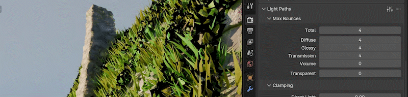 在Cycles渲染器中,如果您计划使用小屋的 foliage(藤蔓和/或草),我建议在渲染属性中将透明最大反弹次数设置为24-32: