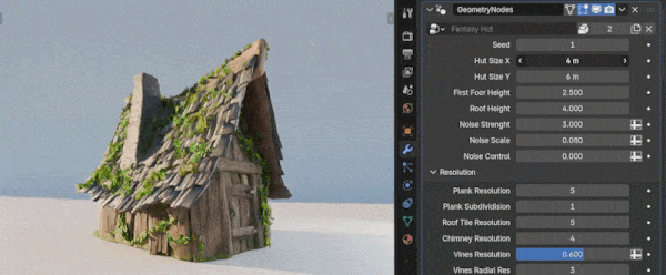 这是一个使用几何节点制作的程序化幻想小屋生成器,拥有大量可调参数,让您能够创造出千变万化的不同样式。使用时,您可以将小屋的blend文件附加到您的项目中。或者,您也可以将其存储到您指定的文件夹中,并在Blender偏好设置>文件路径>资产库中添加该路径,从而将其添加到您的资产库中。