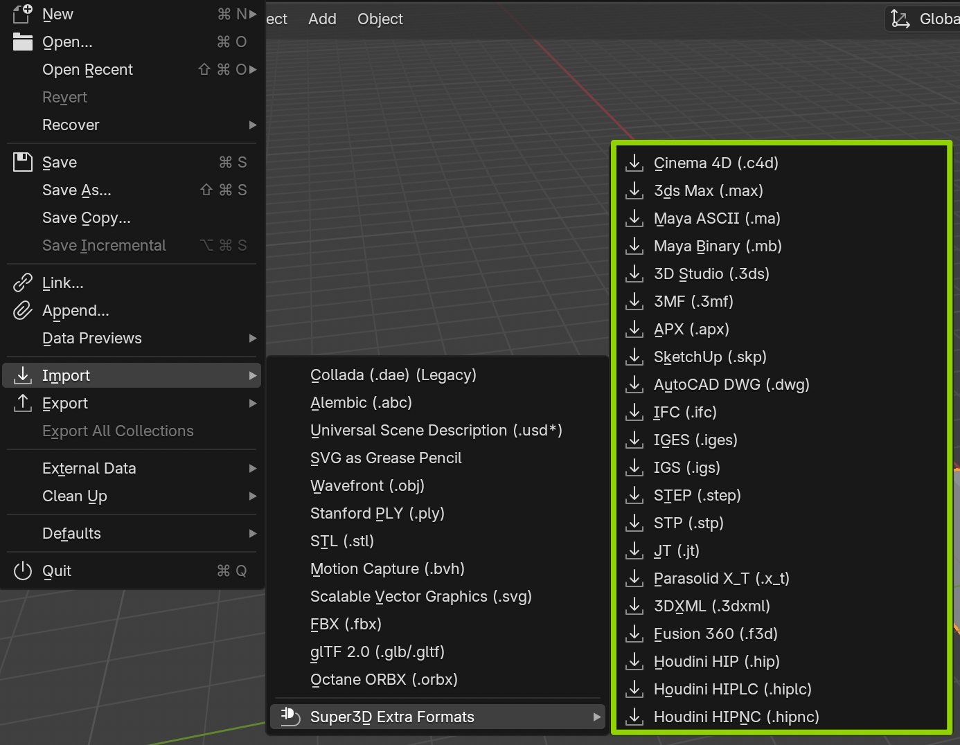 导入和导出超过20种Blender原生不支持的3D文件格式。